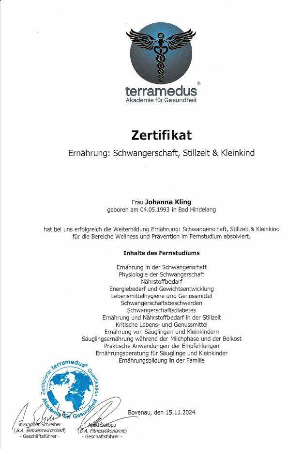 Um auch die offiziellen Empfehlungen zur Ernährung ab dem Kinderwunsch in die Beratung mit einbinden zu können, habe ich zudem die Weiterbildung zur Ernährung in Schwangerschaft und Stillzeit sowie für Säuglinge und Kleinkinder bei Terramedus absolviert (das Logo wird sich bald unten neben dem Ecodemy-Siegel einreihen, nachdem ich tatsächlich verschlafen habe, es anzufordern).